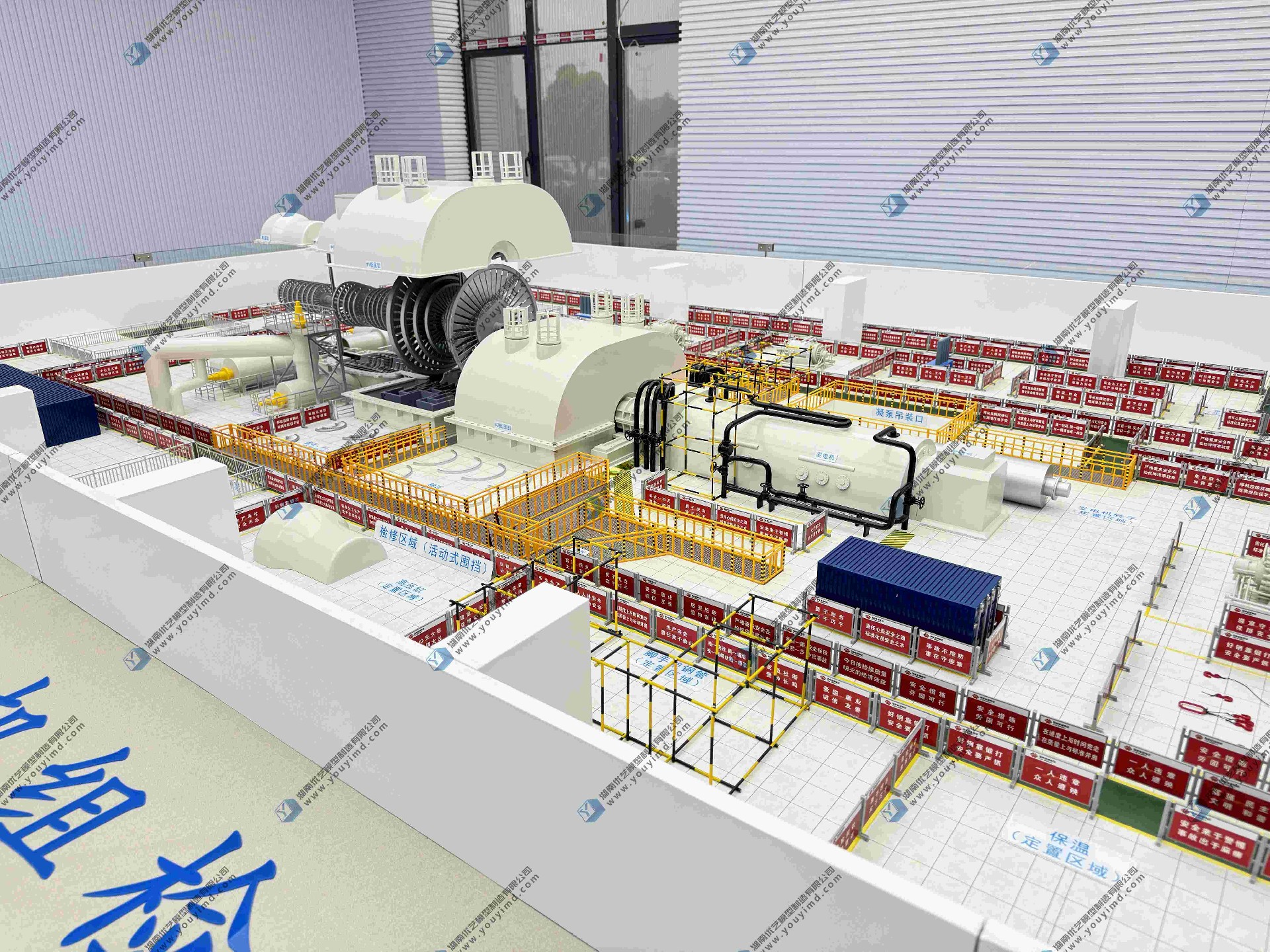 检修作业区:围绕核心设备划分多个标准化检修工位,以黄色防护栏界定作业范围,红色警示标识明确安全边界,还还原了检修脚手架、工具存放区等辅助设施,