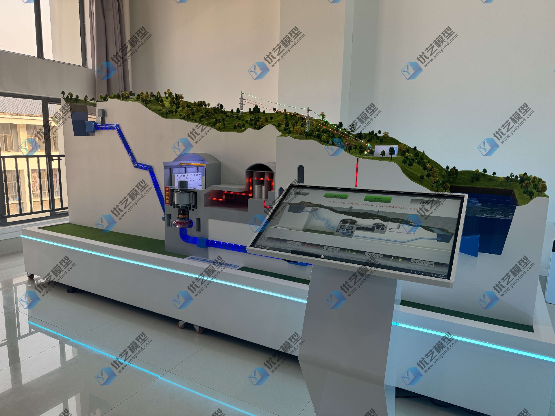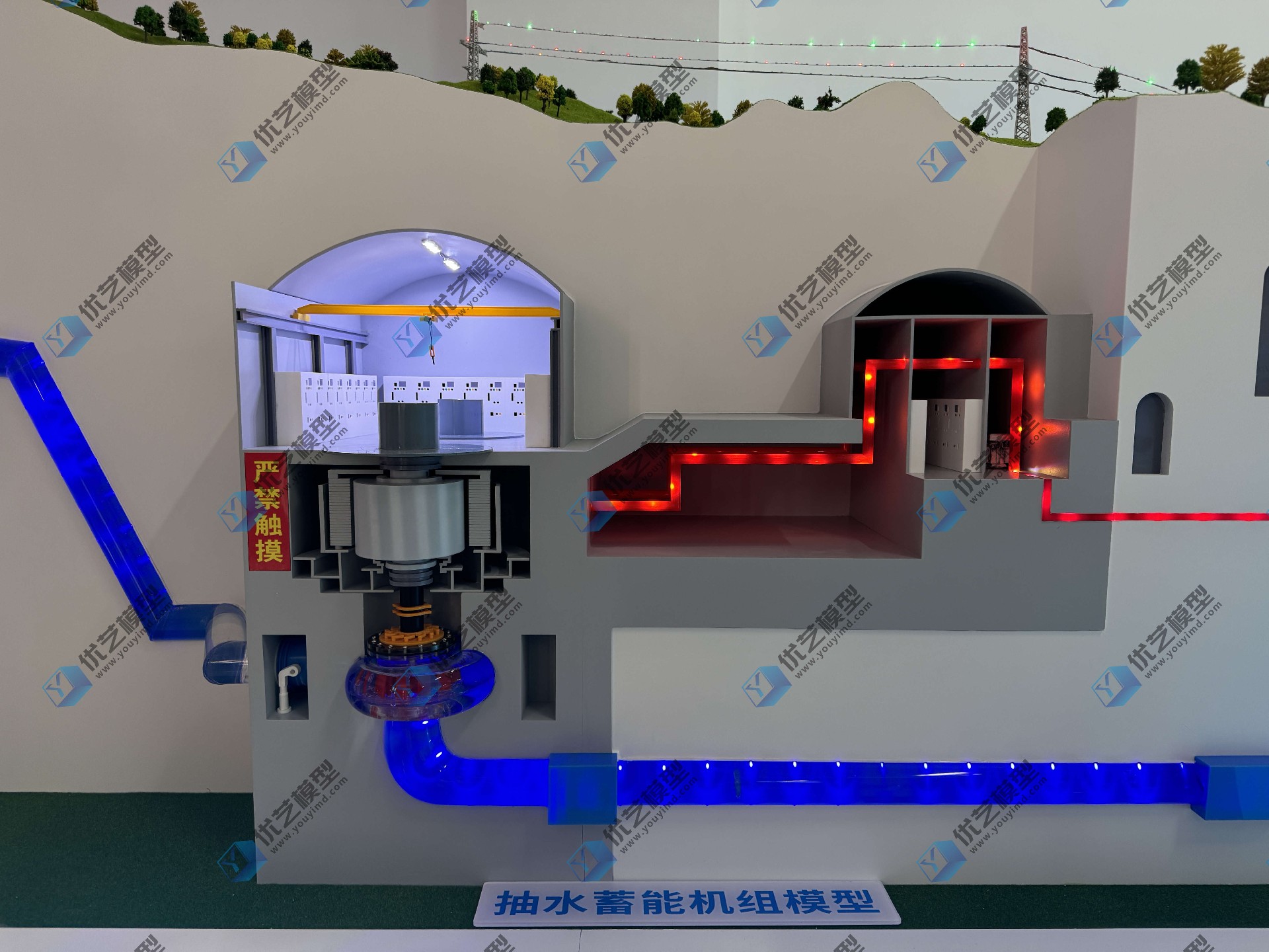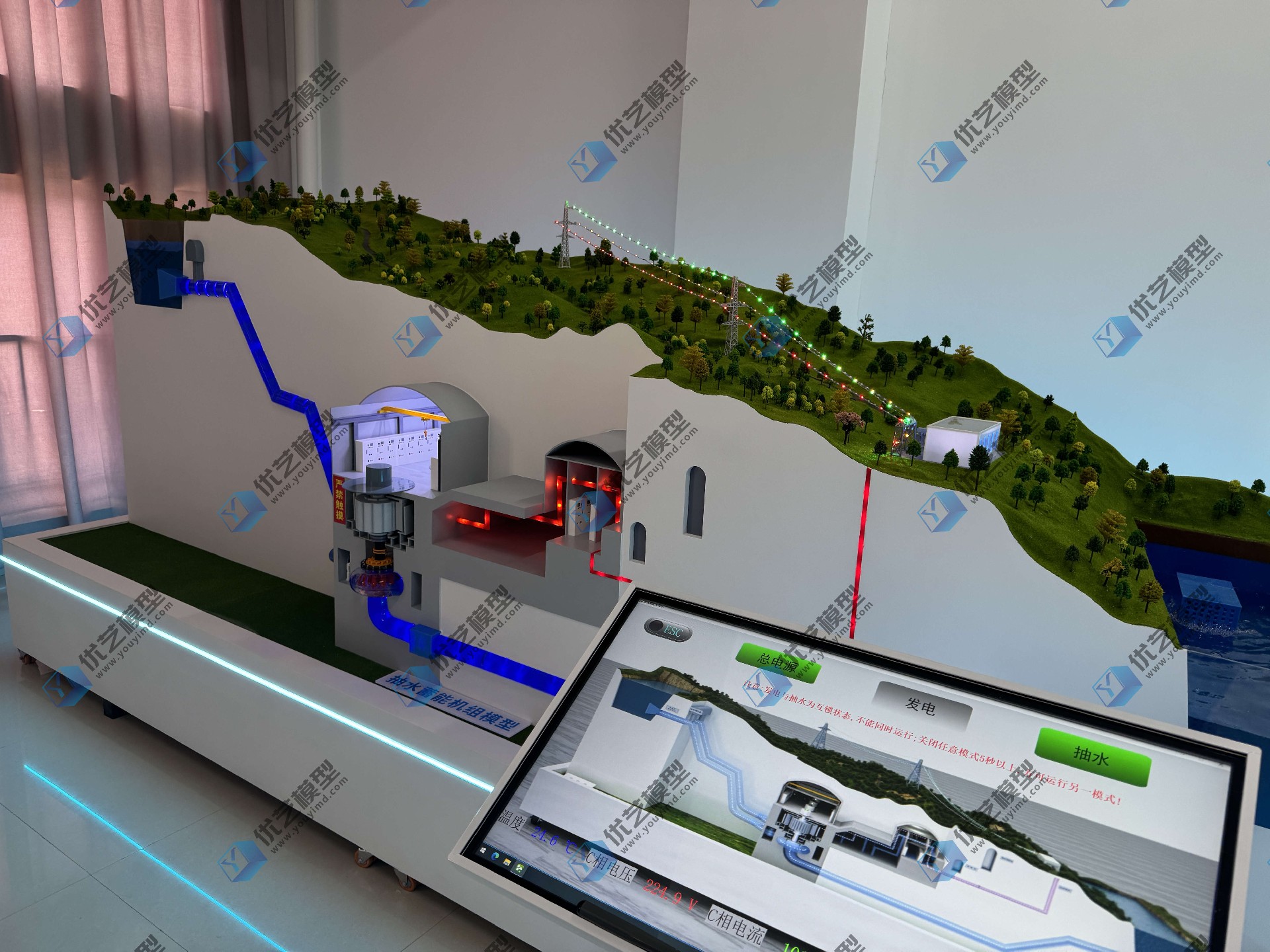 抽水蓄能水电站动态剖面结构仿真教学模型,是湖南省优艺模型根据业主需求定制设备,本模型是一款集教学演示、技术培训、科普展览于一体的高端专业设备。其总长4米,以精确的比例与高度仿真的结构,完整揭示了抽水蓄能电站的核心工作原理。模型集成了光电机械系统,由可编程逻辑控制器(PLC)与中央触控电脑进行智能化管理。它能够生动模拟抽水蓄能电站的两种核心工作状态:
